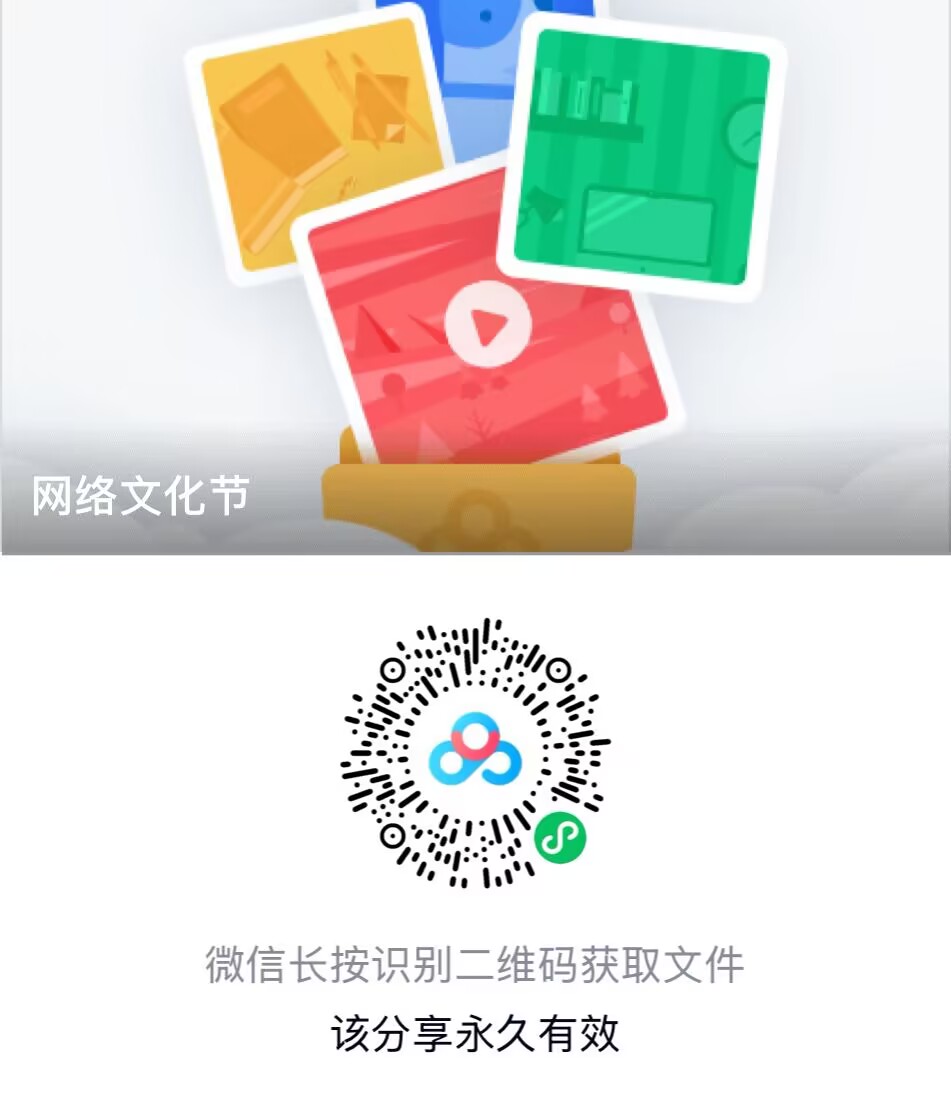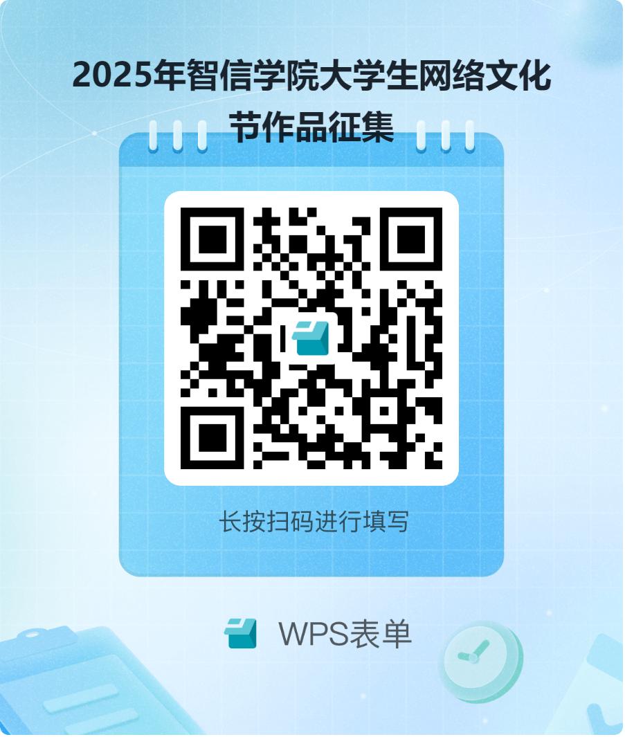 3. 所有类型申报作品的电子版,《信息表1》《汇总表1》Word版,组织推荐作品除上述材料外另需《信息表1》盖章扫描件PDF版1份(可以先不用盖章发新媒体邮箱,由学院统一审核打印后盖章),汇总至一个文件夹后上传至“百度网盘”。所有作品通过https://f.wps.cn/g/7xaSpE9M/【WPS表单】邀你填写「2025年智信学院大学生网络文化节作品征集」进行登记(或者扫描二维码),将上传该文件夹的“百度网盘”链接(设置为永久有效)上报。