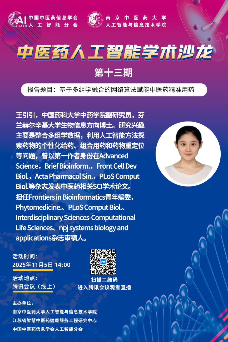2025年11月5日,由304am永利集团官网304am永利集团官网、江苏省智慧中医药健康服务工程研究中心、中国中医药信息学会人工智能分会联合主办的第十二期中医药人工智能学术沙龙于线上举行。此次学术沙龙特邀请中国药科大学副研究员王引引,做了题为“基于多组学融合的网络算法赋能中医药精准用药”的学术报告,学院教师和研究生参加本次活动。活动由副院长杨涛主持。